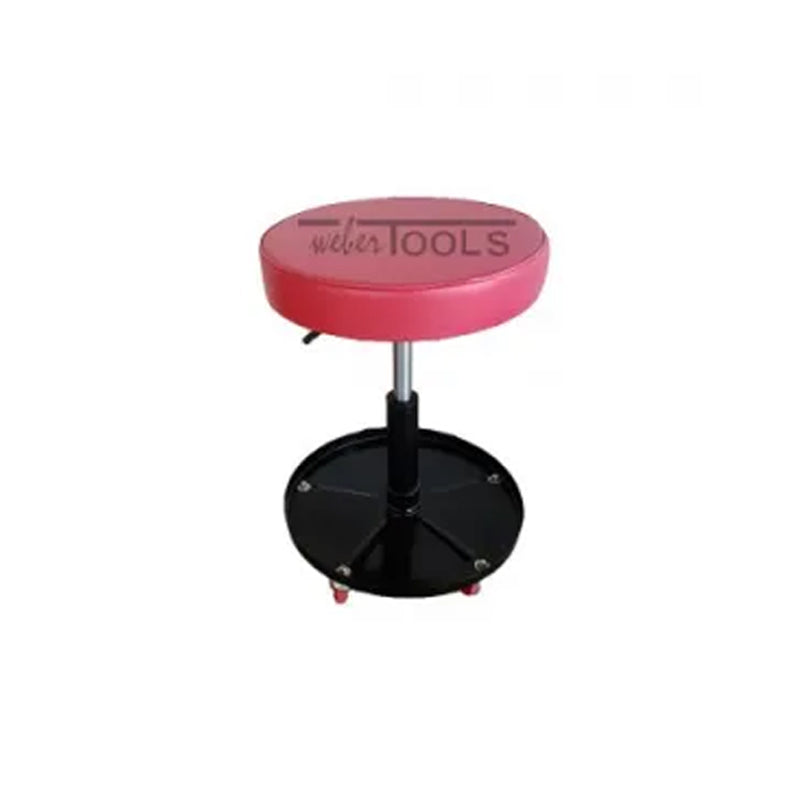 Mobiler höhenverstellbarer Werkstatthocker. Grundplatte zur Aufbewahrung von Werkzeugen und Kleingeräten. Bequemer weicher Sitz mit einem Durchmesser von 36 cm. Hydraulische Höhenverstellung, einstellbar von 38 cm bis 51 cm Sitzhöhe. Fünf montierte solide Schwenkräder.