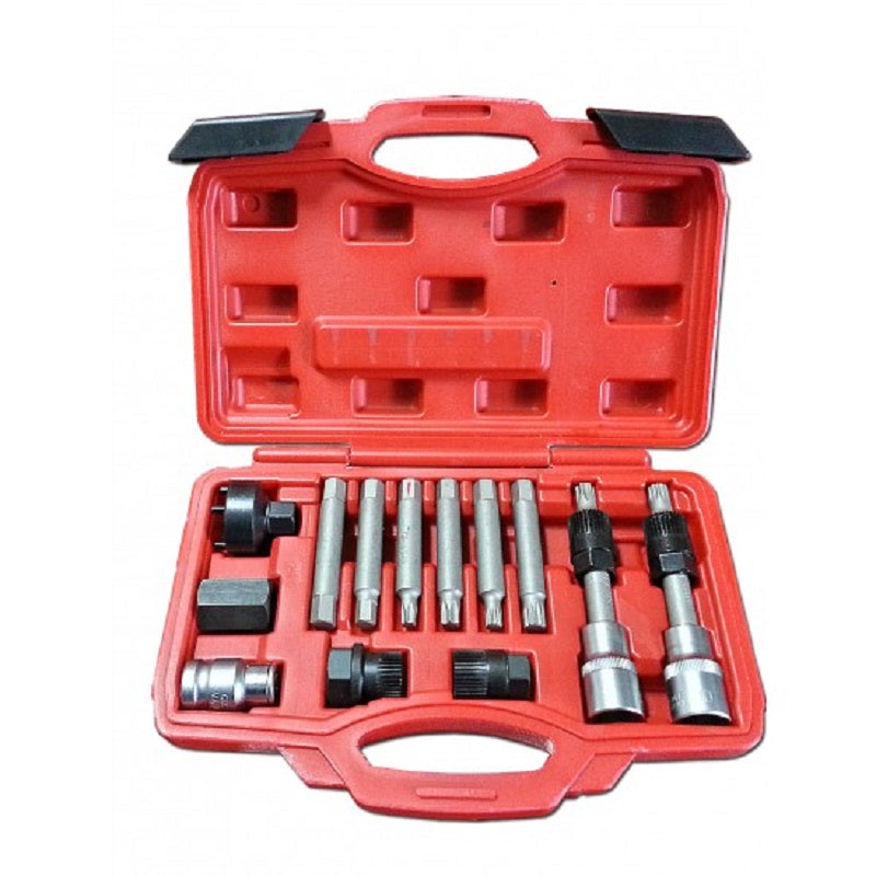 Die Schlüssel ermöglichen das gleichzeitige Lösen der Riemenscheiben-Befestigungsschraube (mit dem entsprechenden Bit) und das Halten der Riemenscheibe mit der Kupplung (mit einem speziellen Steckschlüssel). Das Kit enthält: - 1/2" Torx T50 Sechskantschlüssel mit Schlitzschlüssel 33 Zähne (Typ Bosch), L = 110 mm, - 1/2" Sechskantschlüssel: SPLINE (XZN) M10 mit Schlitzschlüssel 33 Zähne (Bosch Typ), L = 110 mm, - Sechskant-Bit: Torx T40, L = 75 mm, - Sechskant-Bit: Torx T50, L = 75 mm, - Sechskant-Bit: SPLINE (XZM) M8- L = 75 mm, - Bit 6 - Winkel: SPLINE (XZM) M10, L = 75 mm, - Sechskant-Bit: HEX 8 mm, L = 75 mm, - Sechskant-Bit: HEX 10 mm, L = 75 mm, - Stecknuss 6- 15 mm x 33 Zähne (Porsche) - 22 mm x 33 Zähne Innensechskant (Mercedes), - 17 mm Innensechskant x 4 Stifte (Typ Magneti Marelli), - 22 mm Innensechskant (Renault, Volvo), - 1/2 "x 10 mm Bit-Adapter, - Koffer.