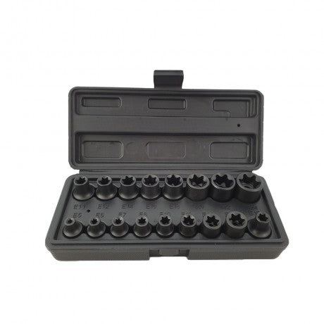 17 x Schlagschrauber Nüsse E-Profil Antrieb 1/2": E10 - E11 - E12 - E14 - E16 - E18 - E20 - E22 - E24 Antrieb 3/8“: E5 - E6 - E7 - E8- E10 - E12 - E14 - E16 aus hochwertigem Chrom Vanadium Stahl Nüsse in praktischer Kunststoffbox sortiert