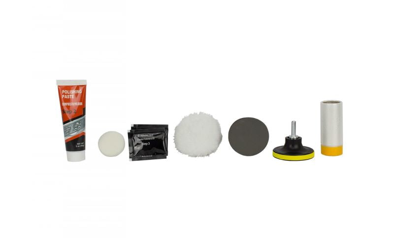 Das Set enthält eine Halterung mit Adapter, mit dem der Scheinwerfer poliert werden kann, um auch die trübsten Linsen wiederherzustellen .