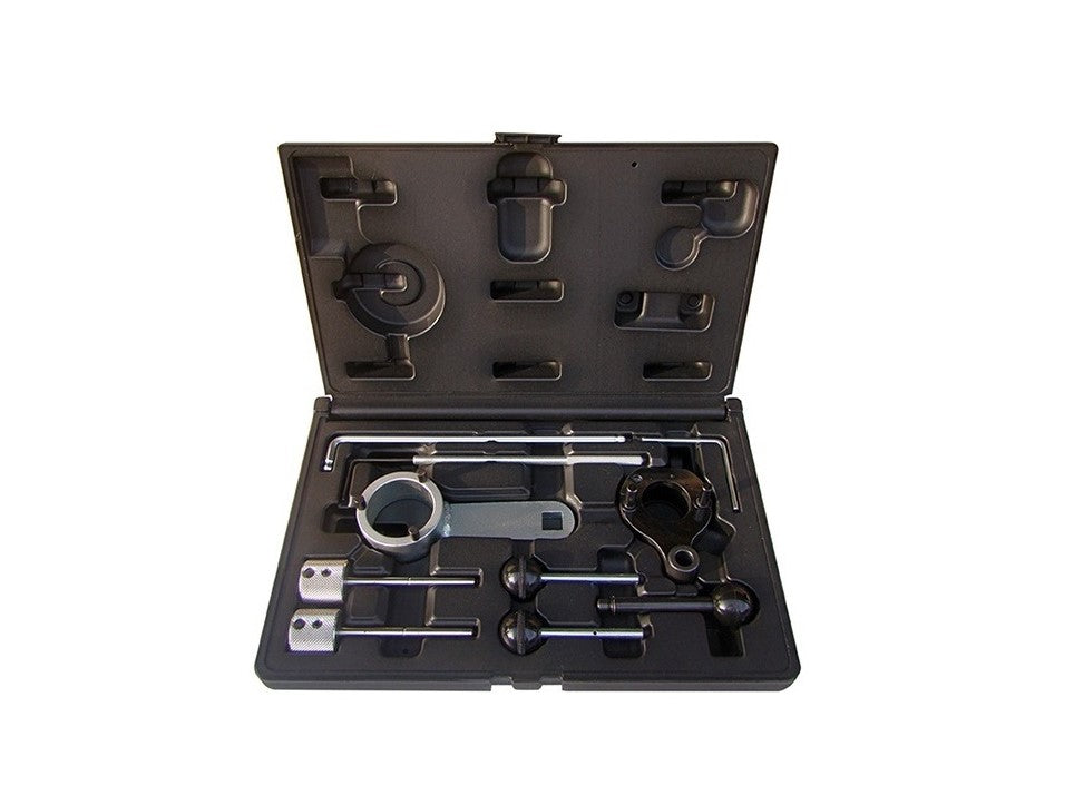 Ein umfassender Werkzeugsatz für den Aus- und Einbau des Nockenwellenantriebsriemens der beliebten VAG-Dieselmotoren 1.6 und 2.0 TDi CR aller VAG-Baureihen ab 2012. Die abgedeckten Motoren besitzen einen Riemen mit einem Zahnradsatz im Kopf. Dieser Werkzeugsatz umfasst die Stifte, die zur Einstellung der Steuerzeiten der Nockenwellen im Kopf erforderlich sind. Inhalt: