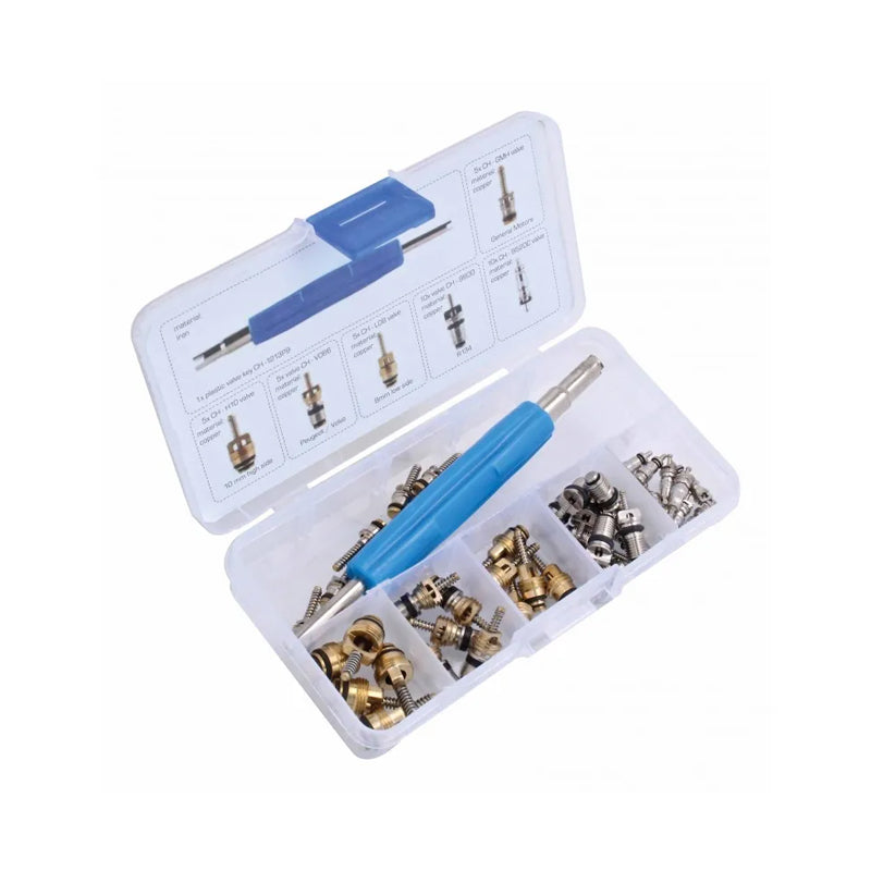 10 x CH-9520C Ventile 5 x CH-L08 Ventile, Unterseite 8 mm 5 x CH-H10 Ventile, Seite 10 mm hoch 1x Ventilschlüssel CH-1213P9 5 x Ventile CH-GMH, General Motors 5 x Ventile CH-V066, Peugeot / Volvo 10x Ventile CH-9800, R134
